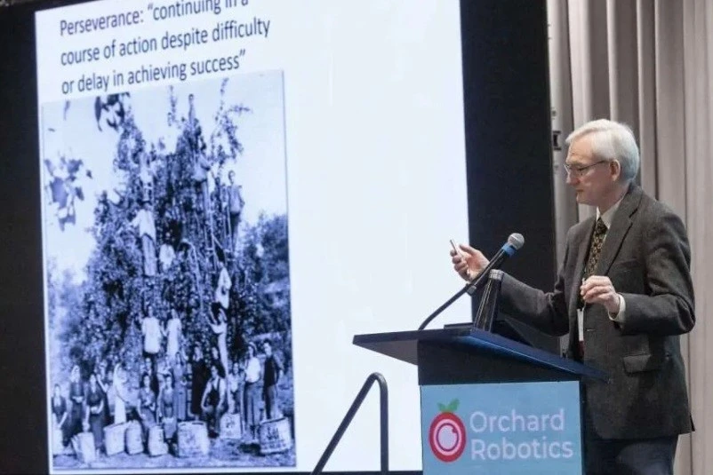 The history-encompassing discussion covered how wild cherry trees grow to 130 feet (39.6 meters) in the forest, the introduction of dwarfing rootstocks and how AI-powered scanning has begun measuring everything from buds to canopy to trunk diameter.