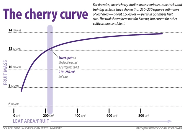 For decades, sweet cherry studies across varieties, rootstocks and training systems have shown that 210 to 250 square centimeters of leaf area — about 5.5 leaves — per fruit optimizes fruit size. Beyond that, the fruit’s growth curve starts to flatten. More specifically, the spur leaves contribute the most toward fruit size and sweetness, two key quality indicators.