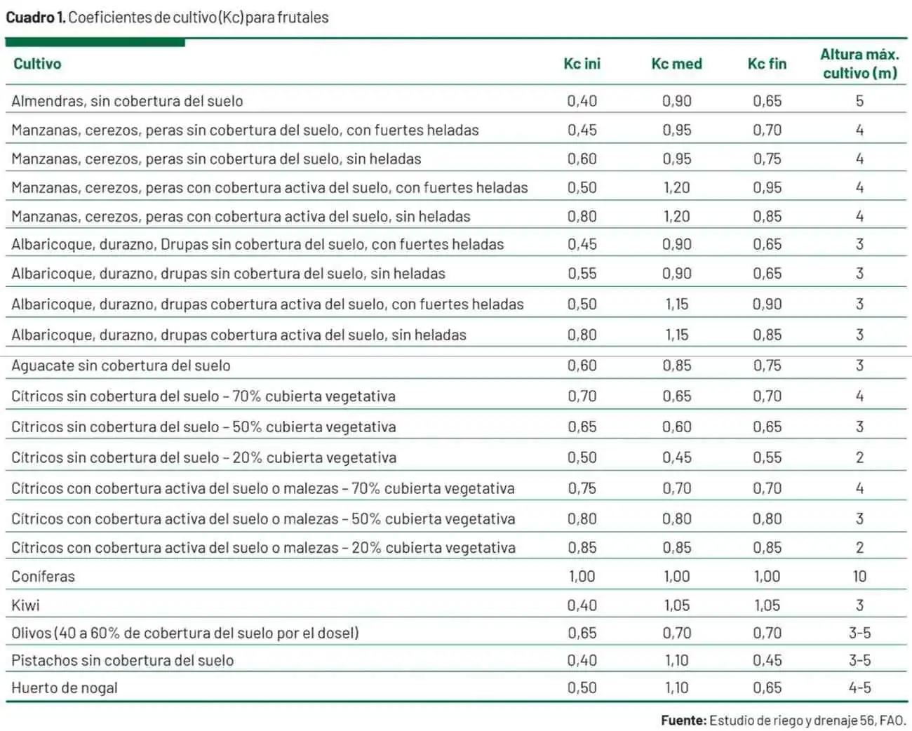 ETo values can be checked at agrometeorologia.cl/evapotranspiracion or calculated using a local weather station. The Kc coefficient varies according to phenological stage, biomass development, and transpiration level, with values ranging from 0 (no irrigation required) to 1 (maximum need).