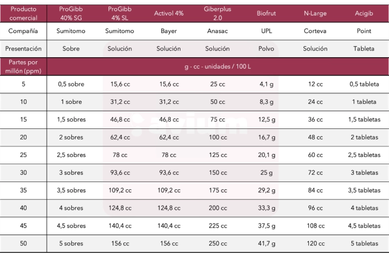 Given the wide range of GA₃ commercial formulations available in Chile, differing in concentration, formulation and format, Avium has developed a reference table showing the correspondence between active ingredient ppm and grams or cc per 100 L of commercial product.