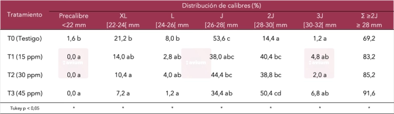 Furthermore, the effect of complementary GA₃ applications has shown a clear positive impact on fruit size and average fruit weight, as well as a marked shift in cherry size distribution toward more commercially appealing calibers (Tables 1 and 2).