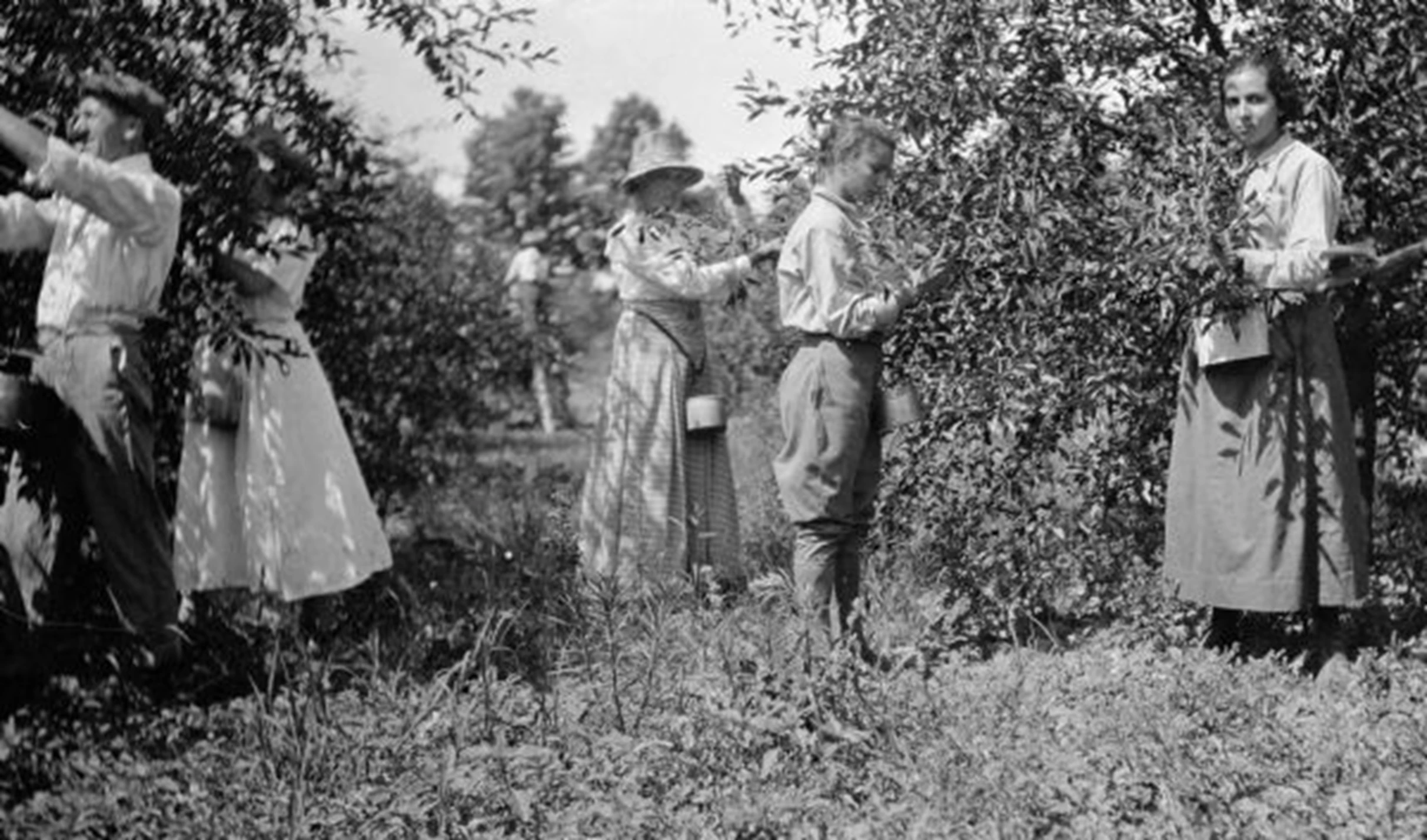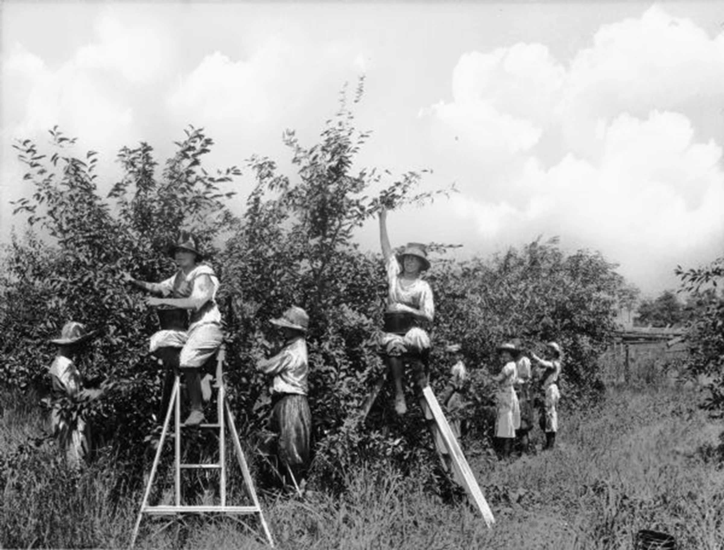 Image 1. Clothilde Hotz (center) and her two daughters (right) harvest cherries in a cherry orchard in Gibraltar. Photograph taken by Ferdinand Hotz in 1919, courtesy of the Wisconsin Historical Society (Image no. 93442).