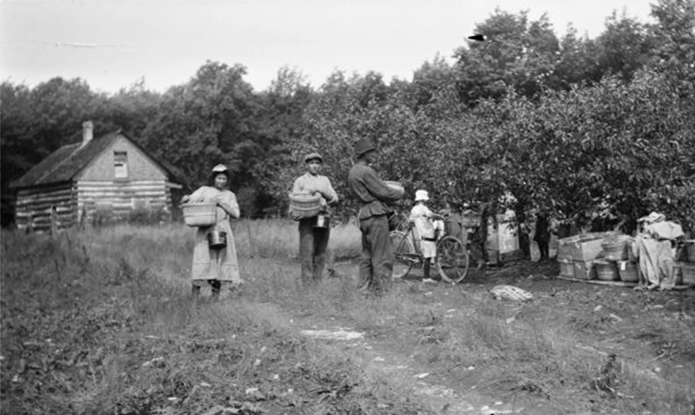 Image 5. A cherry picker’s tools included small buckets with straps tied around the waist, larger buckets and crates to empty personal buckets into, sun hats, and tripod orchard ladders. Photograph from the Wisconsin State Historical Society (Img #77919).