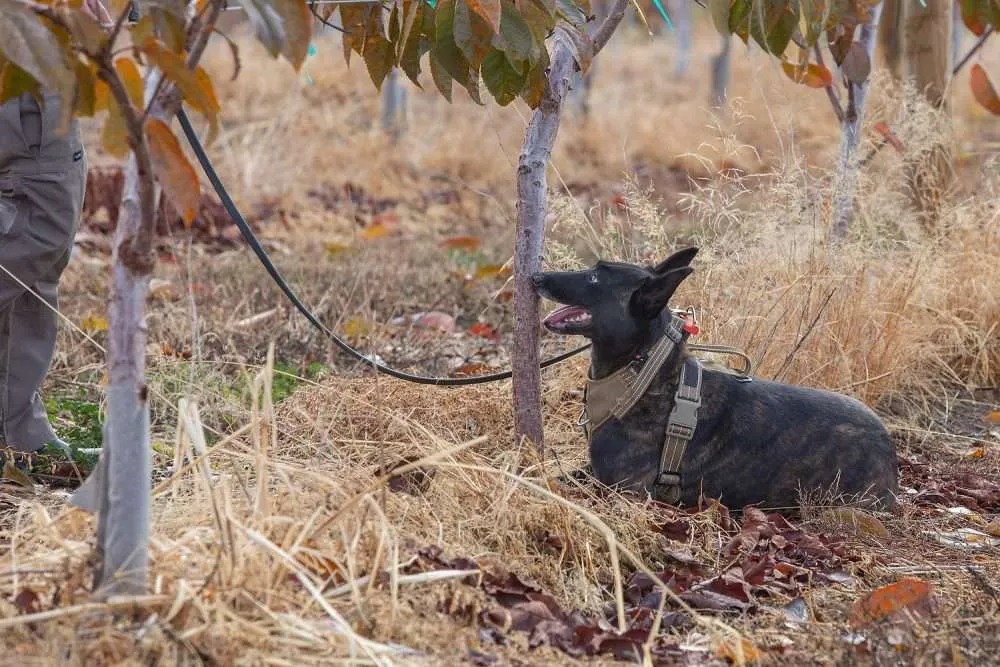 Image 1. Humma of Ruff Country K9 alerts on a Rainier cherry tree she detected as positive for little cherry disease in 2024 in Zillah, Washington. (Ross Courtney/Good Fruit Grower)