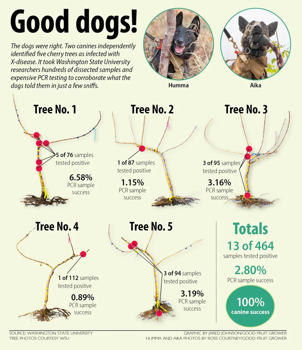 Image 2. This graphic illustrates the results of canine detection and traditional laboratory testing for little cherry disease. (Source: Washington State University; Graphic: Jared Johnson/Good Fruit Grower. Tree photos courtesy WSU; Humma and Aika photos by Ross Courtney/Good Fruit Grower)