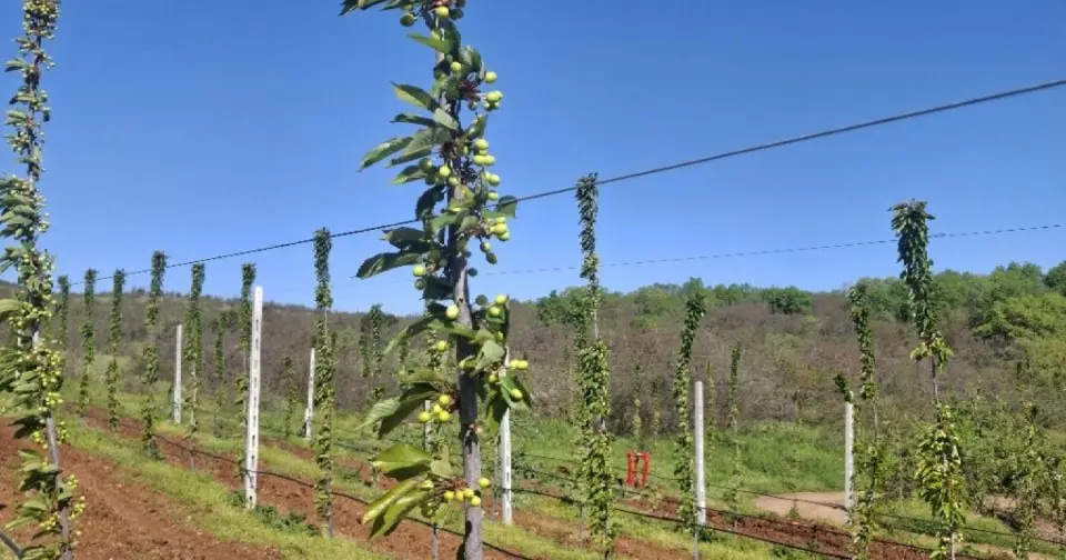 Cherry production in Loutrochori, Edessa, follows modern intensive cultivation standards. The linear system with concrete supports and wires allows for better light exposure, ventilation, and canopy management. At the same time, drip irrigation ensures uniform moisture in the root system.