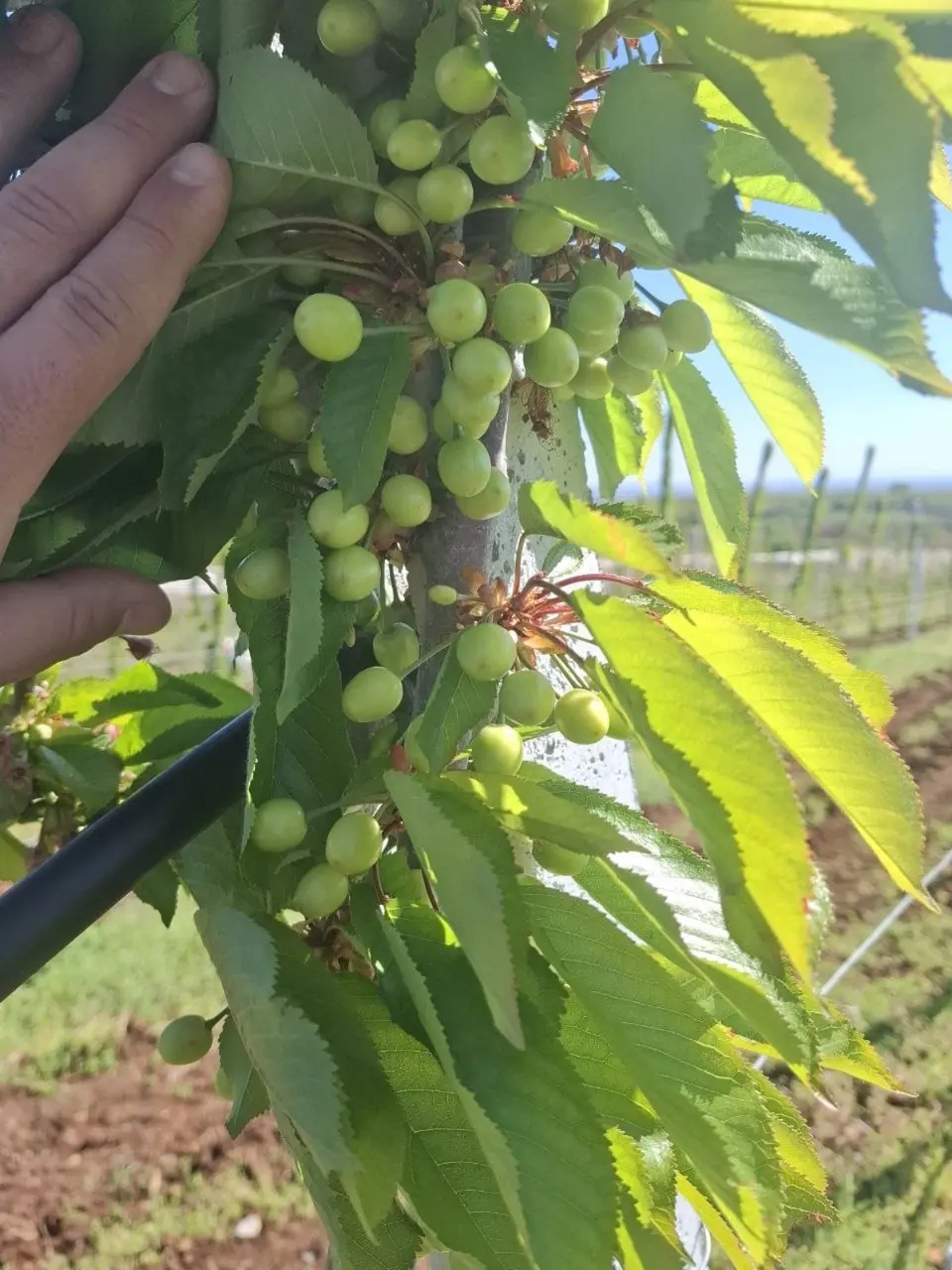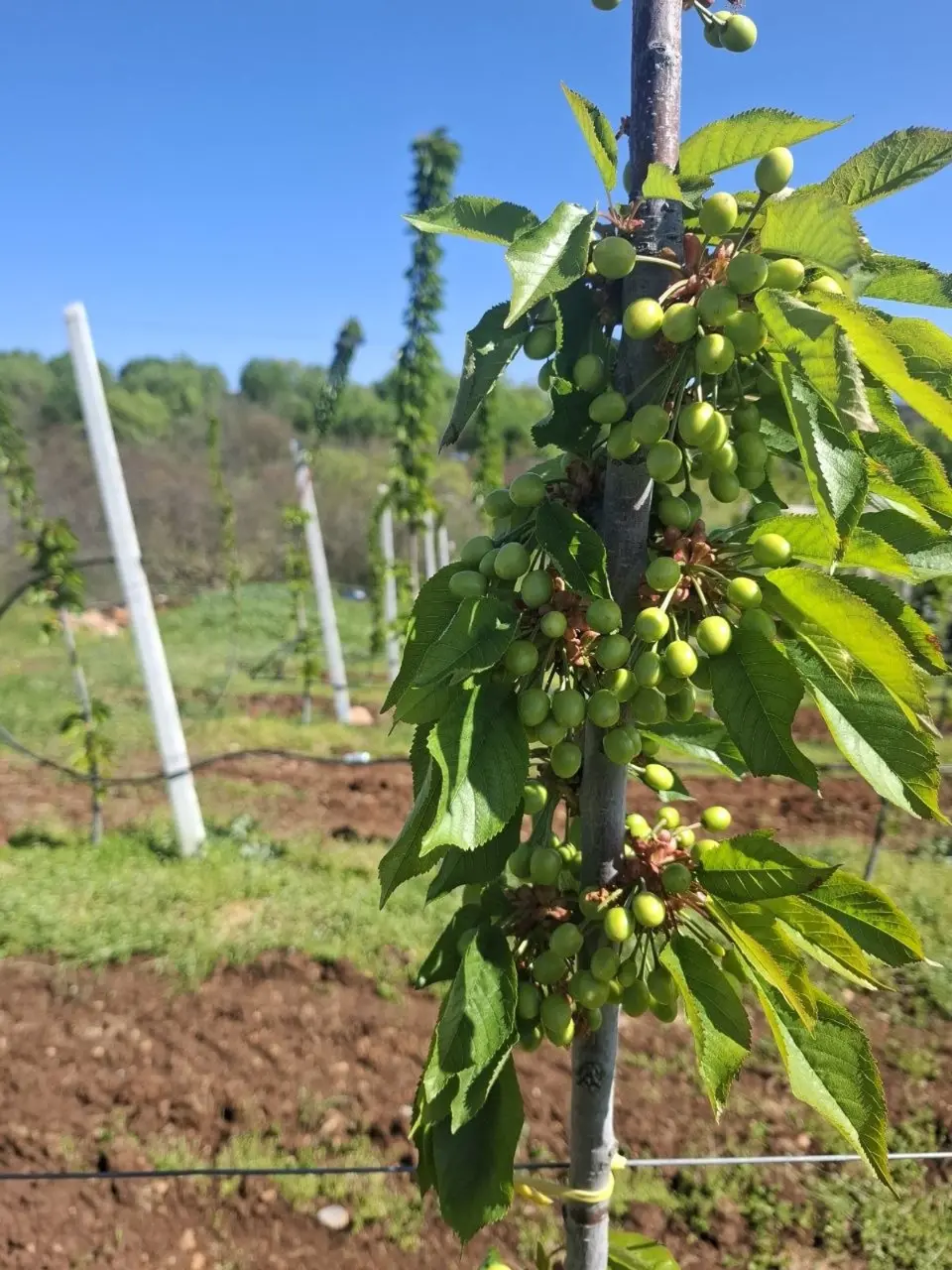 Report from a visit to a new Royal Tioga cherry orchard on Gisela 6 rootstock in Loutrochori, in the Greek region of Edessa. Specifically, the trees were planted in December 2024 and, after about 16 months, already showed an incredibly dense fruit set. What we observed in the field confirms the extreme productivity of this variety from the very first years.