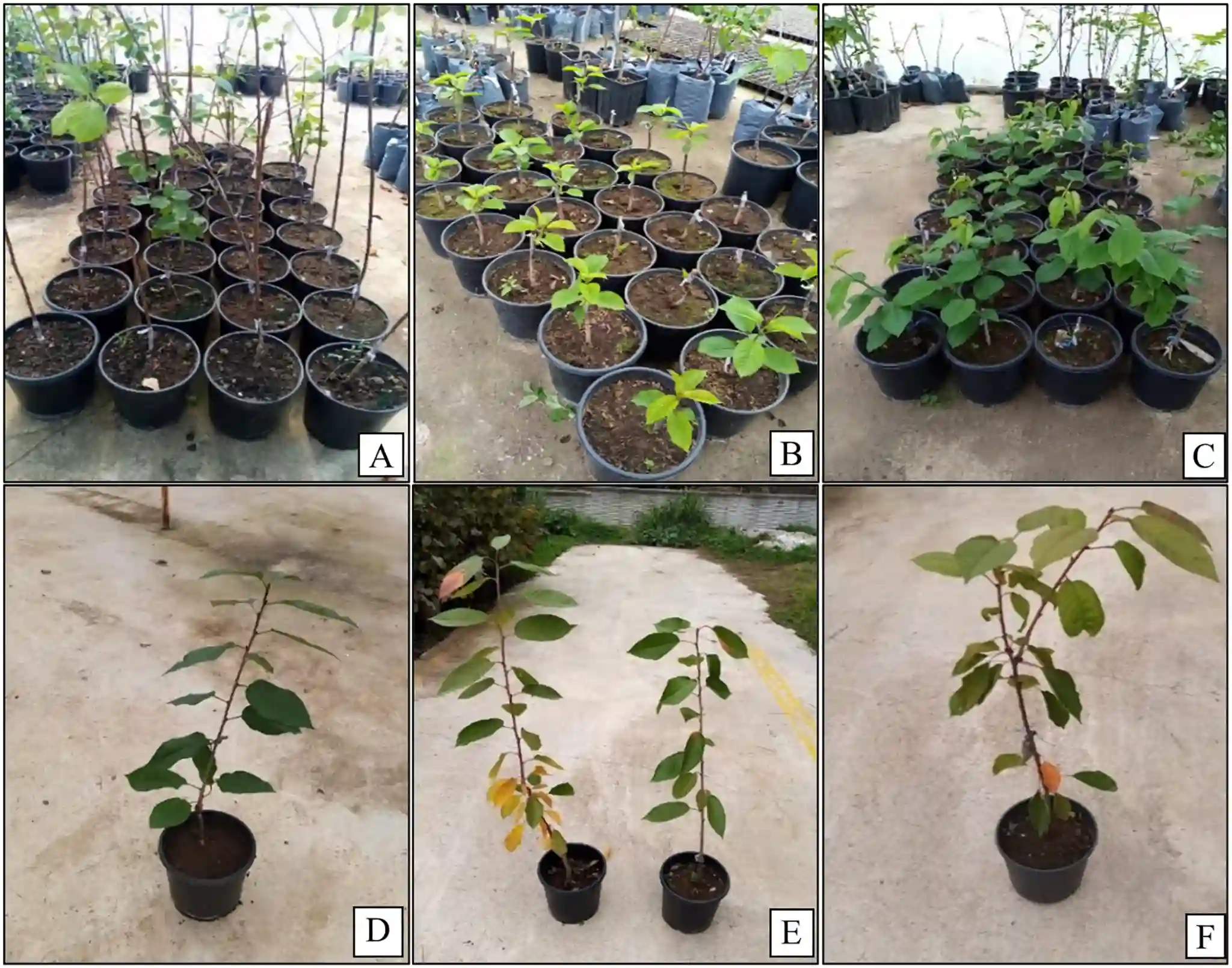 Foto interna 2. Sviluppo dei germogli in combinazioni varietà/portinnesto. (A e D):08 K 056/0900 Ziraat, (B e E):55 K 104/Lambert, (C e F): 55 V 004/0900 Ziraat. Fonte: Aydin et al., 2026