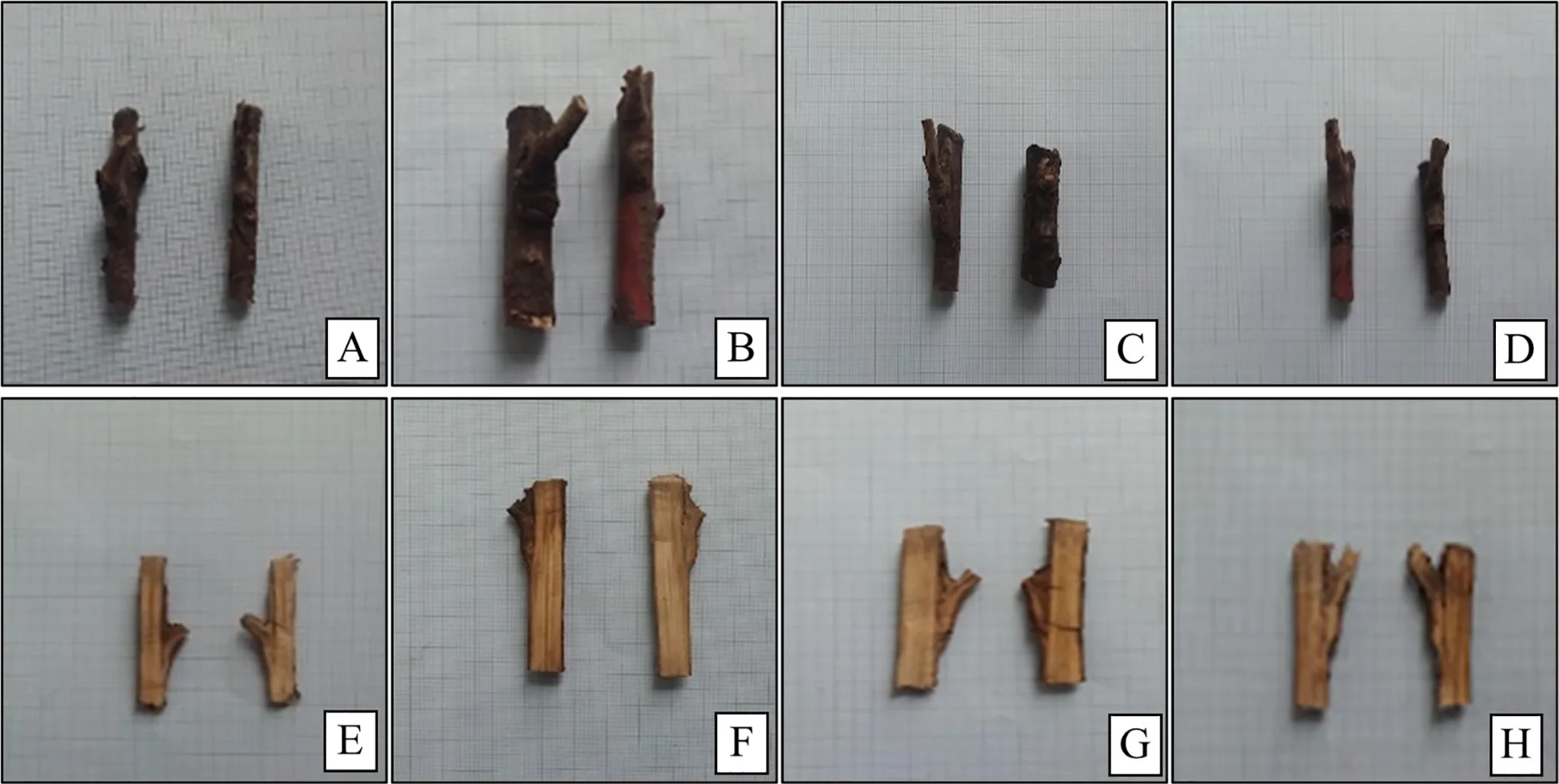 Internal photo 1. Graft development on variety/rootstock combinations after 12 months. (A and E): 08 K 056/0900 Ziraat, (B and F): 55 K 104/Lambert, (C and G): 55 V 004/0900 Ziraat, (D and H): Gisela 6/0900 Ziraat. Source: Aydin et al., 2026