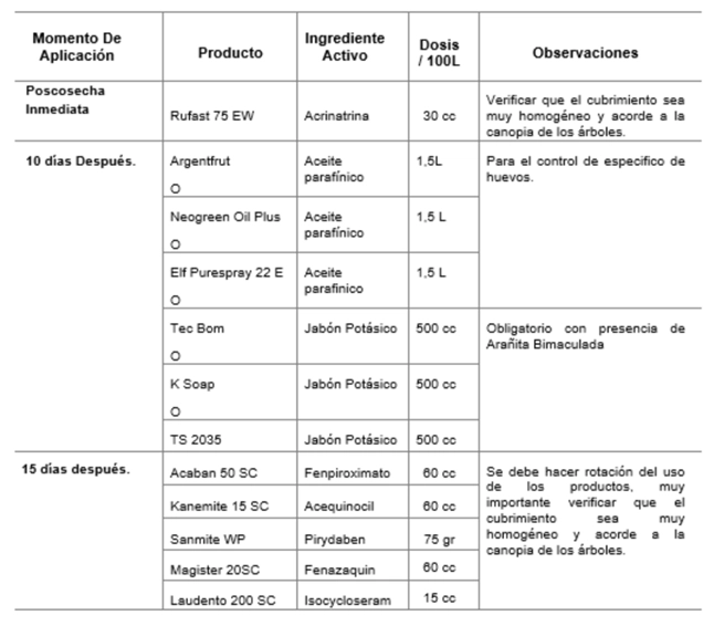 È importante considerare che i prodotti corrispondenti al gruppo 6 secondo la classificazione IRAC (Abamectina o Milbemectina) hanno una modalità d'azione translaminare, per cui il loro controllo è più efficace in fase pre-raccolta, altrimenti la loro efficacia si riduce man mano che la pianta diminuisce la sua attività metabolica.