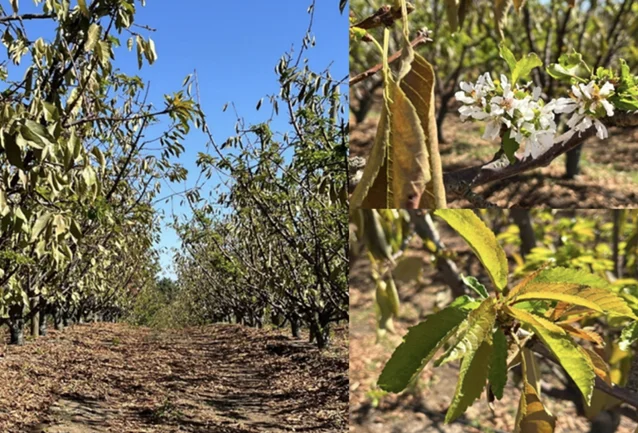 Immagine 9. Frutteto con grave infestazione di ragnetto rosso e carenza idrica, con germogliamento e fioritura a marzo.