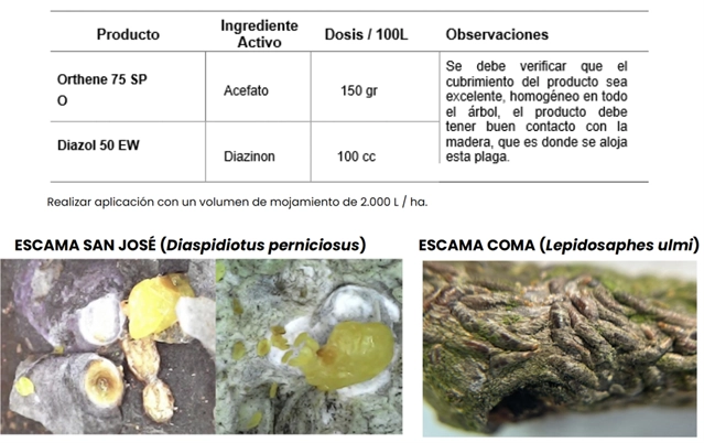 Il controllo chimico dovrebbe essere effettuato sulla seconda generazione di ninfe di cocciniglie migratrici; pertanto, è molto importante applicare il trattamento tempestivamente per un controllo efficace, utilizzando uno dei seguenti prodotti: