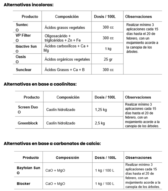 È preferibile utilizzare filtri solari incolori, poiché quelli a base di caolinite ostacolano il movimento degli agenti di controllo biologico degli acari, aumentando il rischio di infestazioni da acari fitofagi.