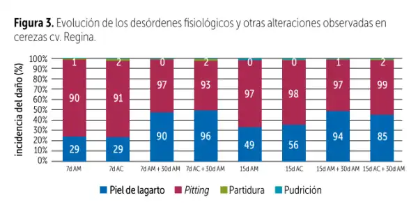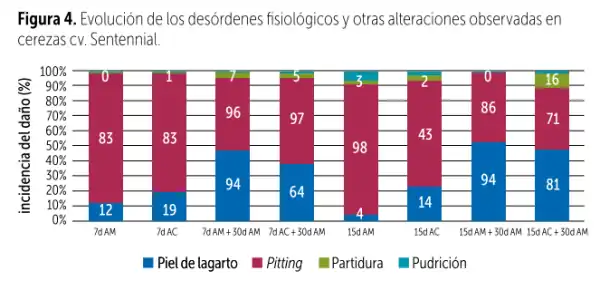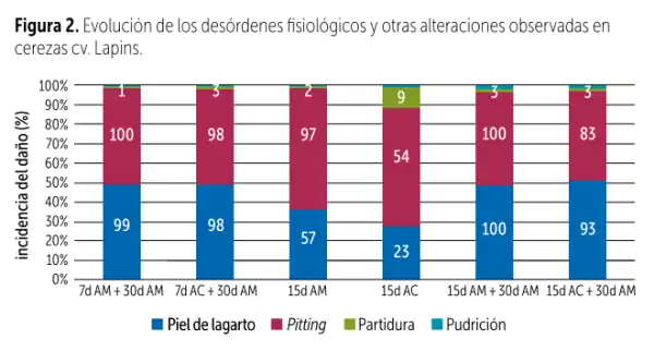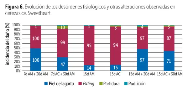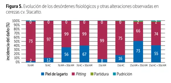 La pelle di lucertola e il pitting ne sono un esempio, con valori prossimi al 100% in entrambi i danni e in entrambe le condizioni di conservazione quando la frutta è stata mantenuta per 7 giorni in AM o AC, seguita dal processo di confezionamento e da una valutazione dopo 30 giorni.
