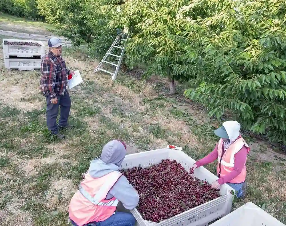 Lupe Muñoz, a sinistra, supervisiona la raccolta delle ciliegie a metà giugno per River Valley Fruit vicino a Grandview, Washington. Ripensando alla stagione 2025, i leader del settore affermano che un grande volume di frutta all'inizio della stagione nel nord-ovest ha invaso il mercato quando i prezzi erano ancora troppo alti e le vendite hanno faticato a decollare. (Ross Courtney/Good Fruit Grower)