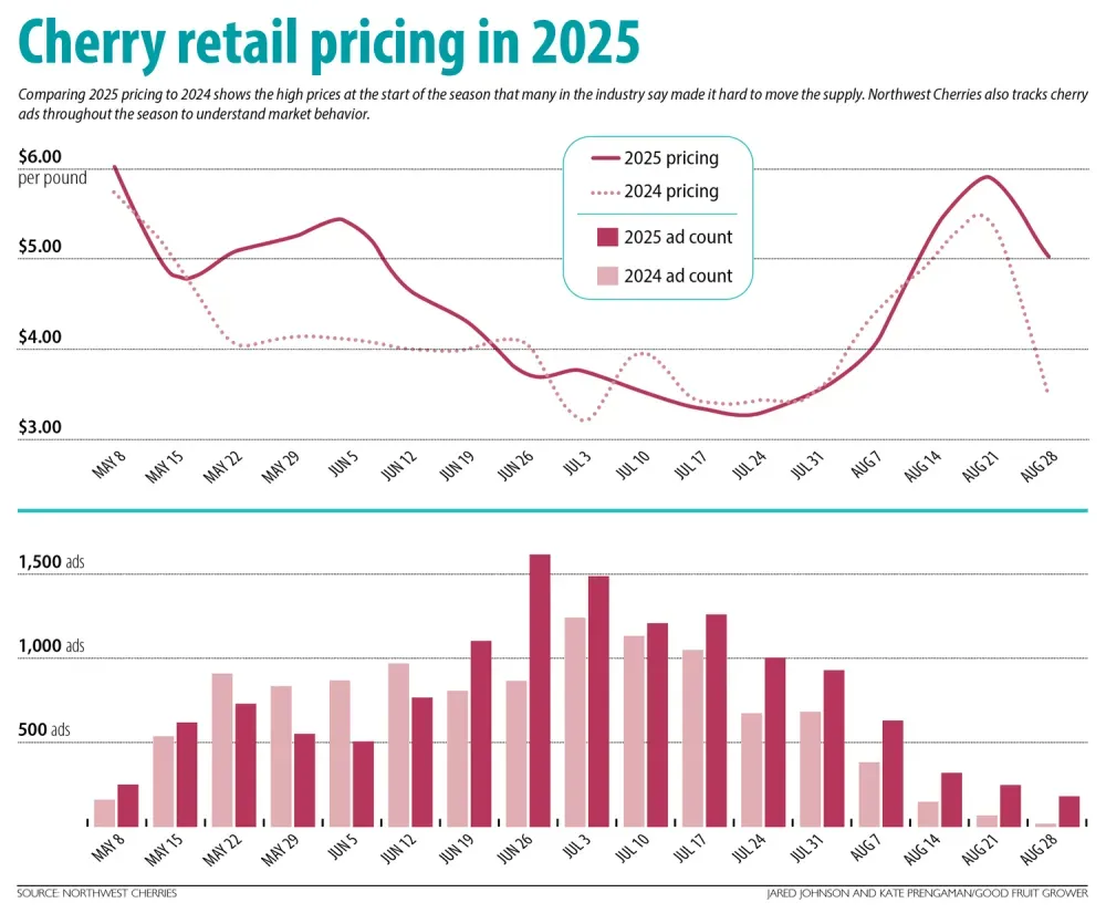 Grafico che mostra i prezzi al dettaglio delle ciliegie nel 2025. (Fonte: Northwest Cherries; Grafica: Jared Johnson e Kate Prengaman/Good Fruit Grower)