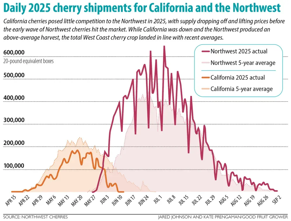 Grafico che mostra le spedizioni giornaliere di ciliegie nel 2025 per la California e il nord-ovest. (Fonte: Northwest Cherries; Grafica: Jared Johnson e Kate Prengaman/Good Fruit Grower)