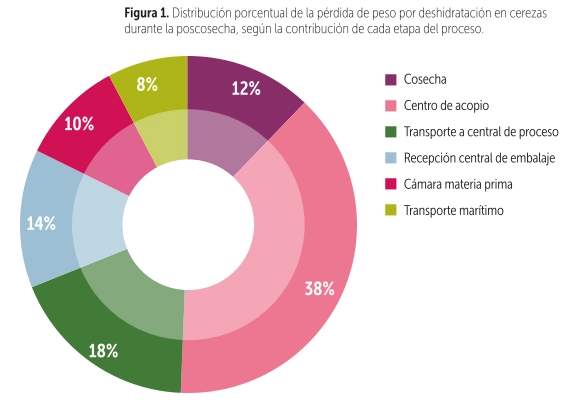 Figura 1. Distribuzione percentuale della perdita di peso per disidratazione nelle ciliegie durante la postraccolta, secondo il contributo di ciascuna fase del processo.