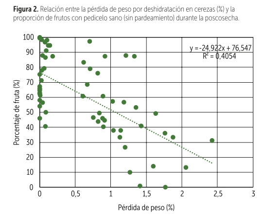 Le evidenze sperimentali lo confermano. Prove condotte dal Dipartimento di R&S di Proyectos Industriales Johnson hanno dimostrato una relazione diretta tra la disidratazione del frutto (misurata come percentuale di perdita di peso) e il deterioramento del peduncolo.