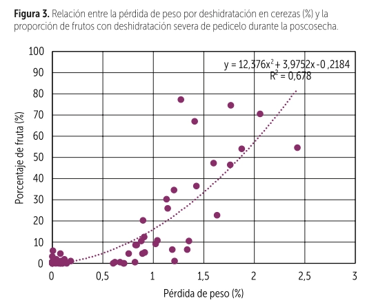 Figura 3. Relazione tra la perdita di peso per disidratazione nelle ciliegie (%) e la proporzione di frutti con disidratazione severa del peduncolo durante la postraccolta.