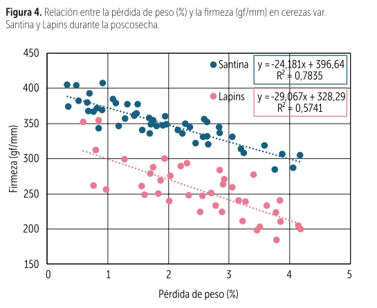 Figura 4. Relazione tra la perdita di peso (%) e la consistenza (gf/mm) nelle ciliegie varietà Santina e Lapins durante la postraccolta.