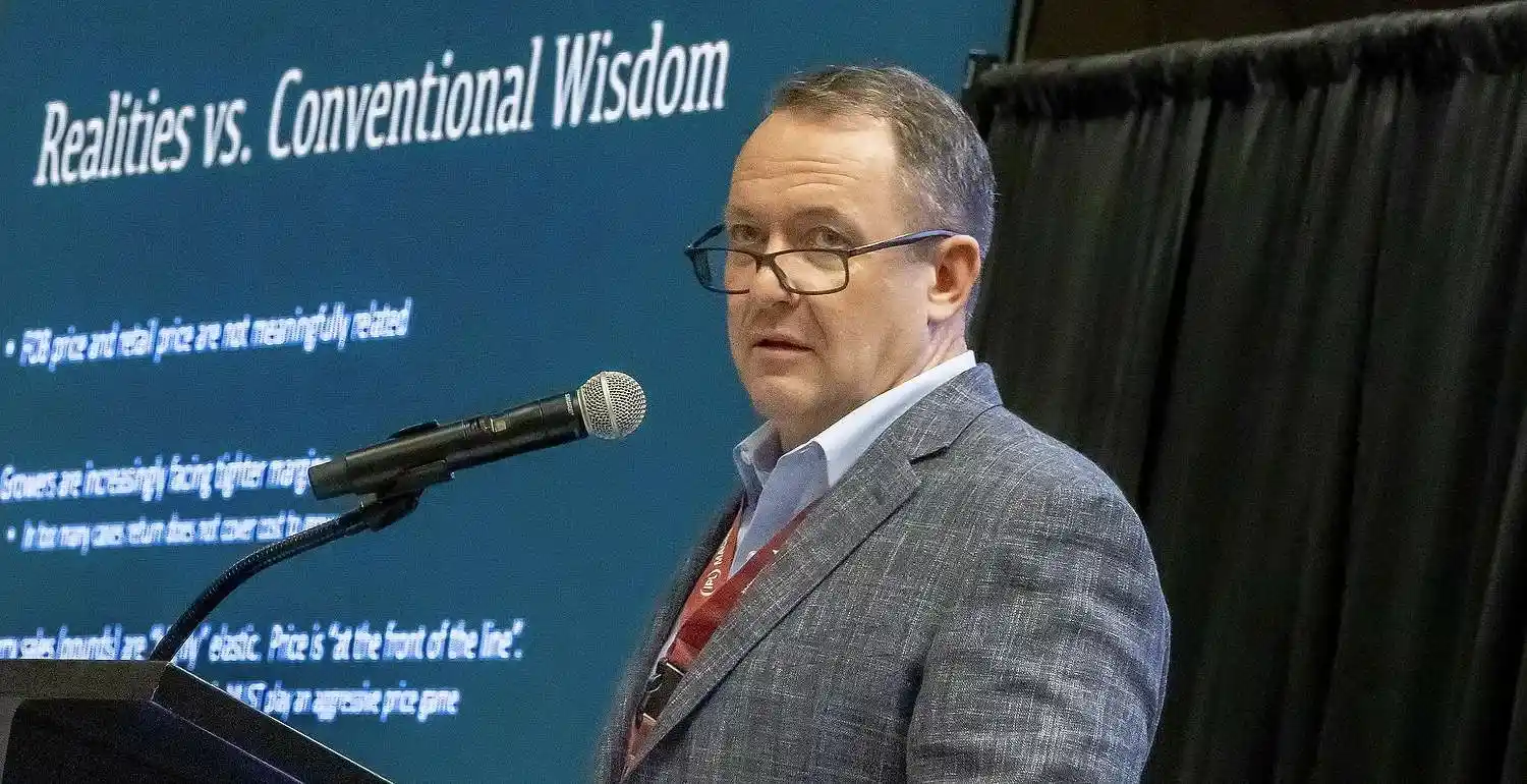Immagine 1. L'analista del settore retail Adam Brohimer afferma che le ciliegie non sono così sensibili al prezzo come molti credono, e che c'è margine per aumentarle per migliorare i profitti dei coltivatori. Brohimer è intervenuto all'83° Cherry Institute annuale presso lo Yakima Convention Center di Yakima, Washington, a gennaio. (TJ Mullinax/Good Fruit Grower)