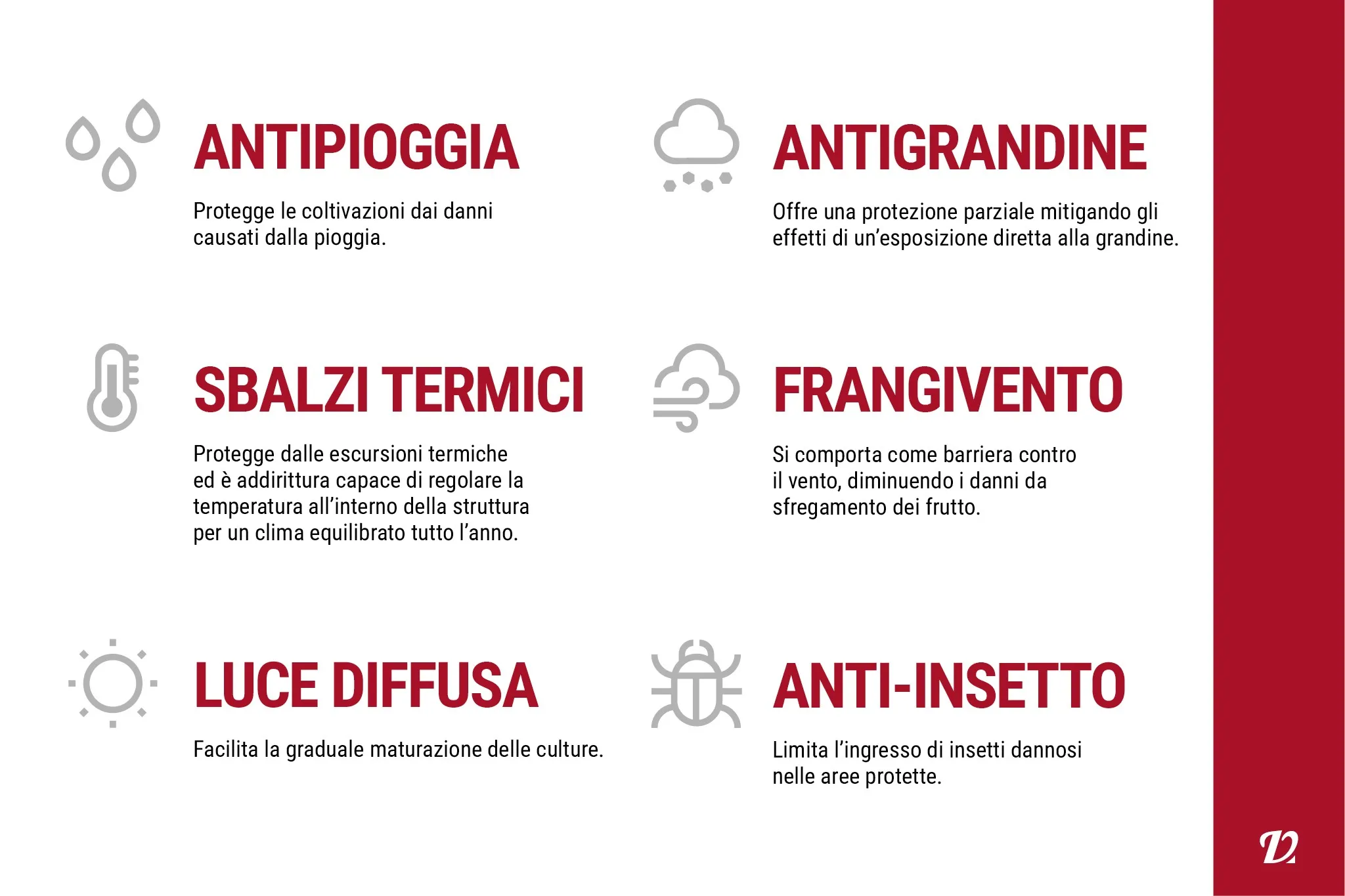 Il raggiungimento di tali risultati passa dal miglioramento del rendimento delle colture alla salvaguardia delle stesse dalle minacce atmosferiche e ambientali. Per farlo, ogni tipologia di impianto completo Valente può essere dotata di diversi sistemi di copertura, anche combinati tra loro, denominati ValenteProtect©.