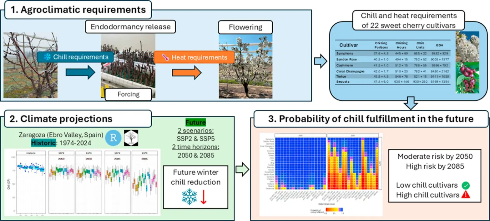 In questo contesto, un recente studio ha analizzato la risposta di 22 cultivar di ciliegio dolce in condizioni climatiche mediterraneo-continentali (Zaragoza, Spagna), integrando dati sperimentali e modellistica climatica per valutare la loro adattabilità futura. L'accumulo di freddo e di calore sono stati quantificati utilizzando i modelli Dynamic, Chilling Hours e Utah per il freddo, ed il modello Growing Degree Hours per il caldo.