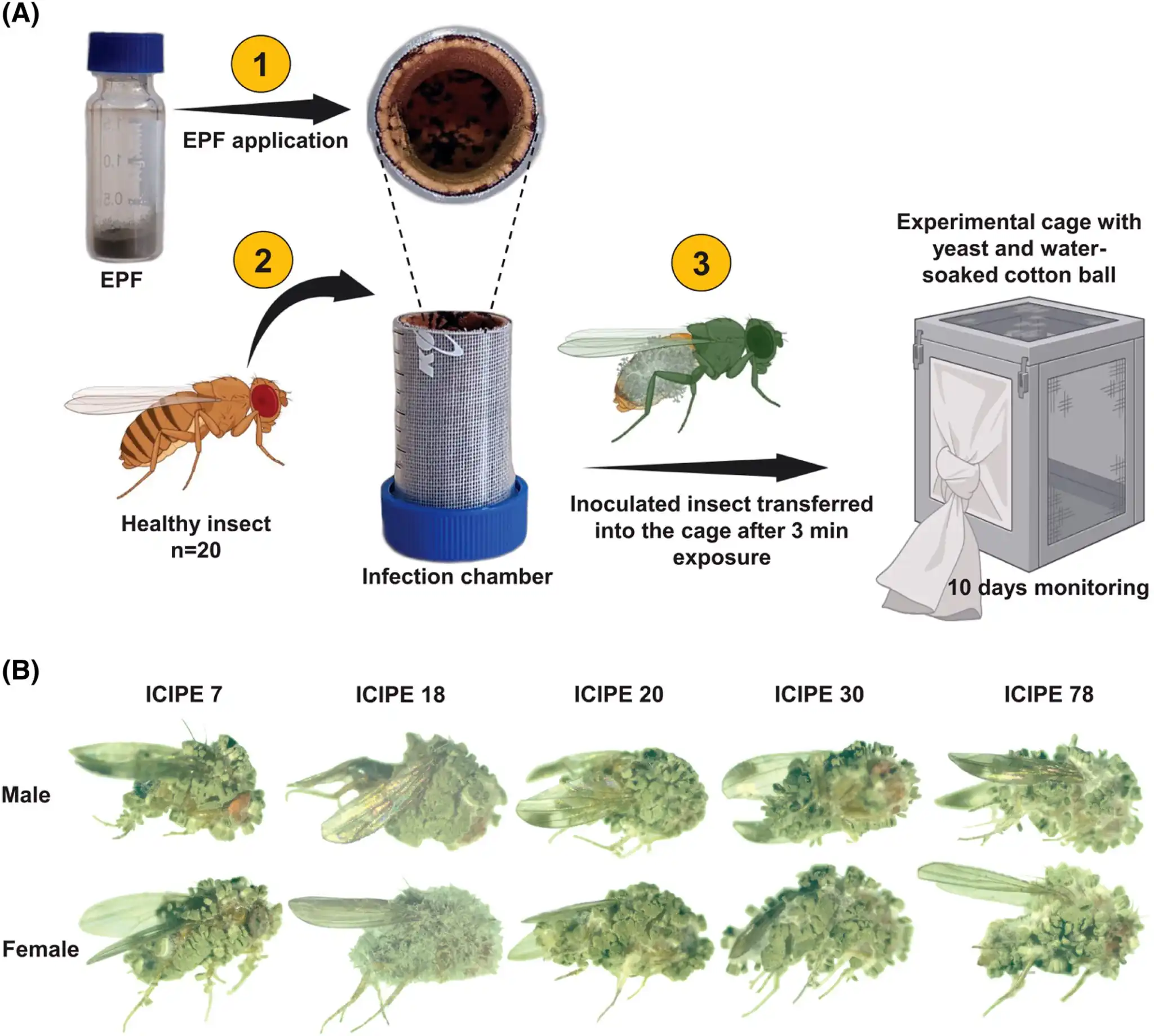 Fonte: Farid, I.M., Ndlela, S., Becher, P.G., Weldon, C.W., Azrag, A.G., Schiöth, H.B., Mohamed, S.A. and Ekesi, S. (2026), Conned by the enemy: the entomopathogenic fungus Metarhizium anisopliae lures and kills Drosophila suzukii. Pest Manag Sci. https://doi.org/10.1002/ps.70576
