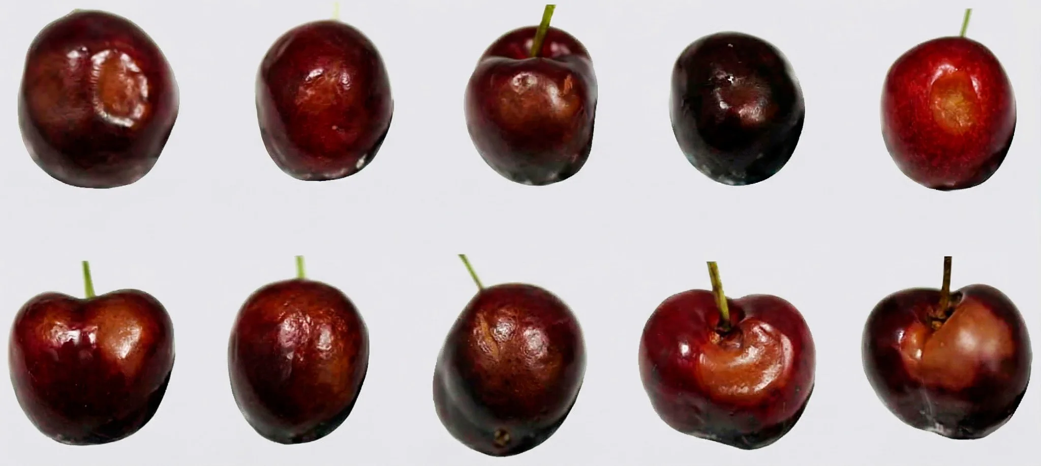 Figura 1. Sintomi esterni rappresentativi della macchia acquosa nella ciliegia dolce ‘Burlat’.