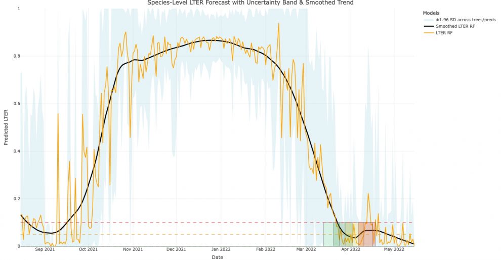 Il pannello LTER mostra le traiettorie stagionali con linee di soglia di riferimento e finestre degli stadi di sviluppo [Green Side (l-green), Green Tip (d-green), Tight Cluster (giallo), Popcorn (arancione) e Bloom (rosso)] per facilitare l’interpretazione stagionale. Grafico a linee del LTER previsto (asse y) rispetto alla data (asse x).