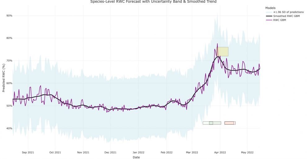 Figura 2. Esempio di traiettoria stagionale RWC per Yakima, Washington (2021–2022), generata utilizzando il modello gradient boosting machine (GBM).