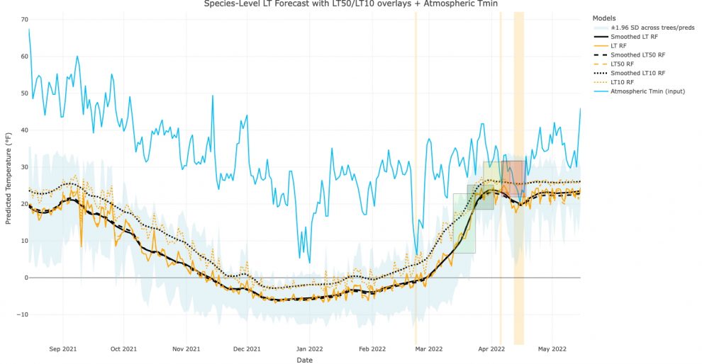 Quando i dati della temperatura minima atmosferica giornaliera (Tmin) sono disponibili — caricati dall’utente o recuperati da NASA POWER o Open-Meteo — lo strumento sovrappone Tmin al pannello della resistenza al freddo. Le aree ombreggiate evidenziano i periodi in cui Tmin scende al di sotto delle soglie previste LT10 (arancione) o LT50 (rosso) per l’interpretazione del rischio di gelo. Grafico a linee della temperatura prevista in Fahrenheit (asse y) rispetto alla data (asse x).