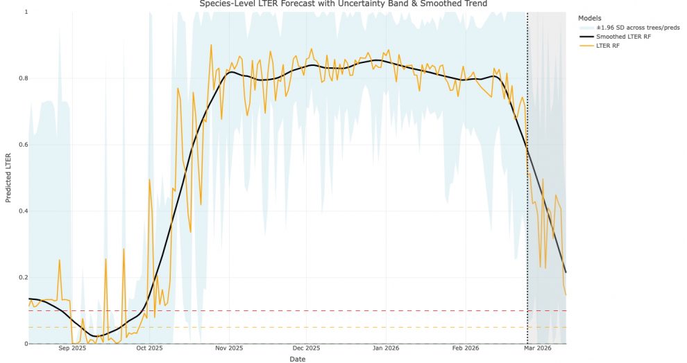 Figura 4. Esempio di previsione LTER per la stagione 2025–2026 a Prosser, Washington, generata utilizzando il modello random forest (RF). L’area grigia indica la finestra di previsione di 14 giorni.