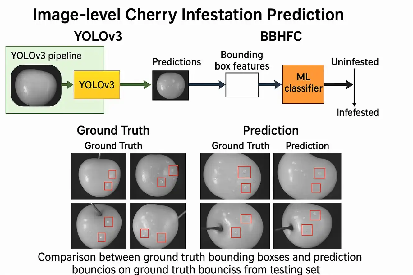 Fonte: Yazdani, M., Bao, D., Zhou, J., Wang, A., & van Klinken, R. D. (2025). Single-Wavelength Near-Infrared Imaging and Machine Learning for Detecting Queensland Fruit Fly Damage in Cherries. Smart Agricultural Technology, 101090. https://doi.org/10.1016/j.atech.2025.101090