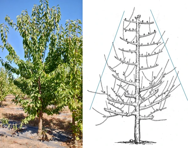 È uno dei più diffusi nei frutteti commerciali cileni. La chioma, tridimensionale, è composta da un unico asse, da cui si dipartono branche primarie che si ramificano in secondarie e terziarie, formando l’unità produttiva: rami con dardi fruttiferi e vegetativi distribuiti su legno di diverse età, e rametti di un anno che emergono da legno di 1, 2 o più anni (Fig. 1).