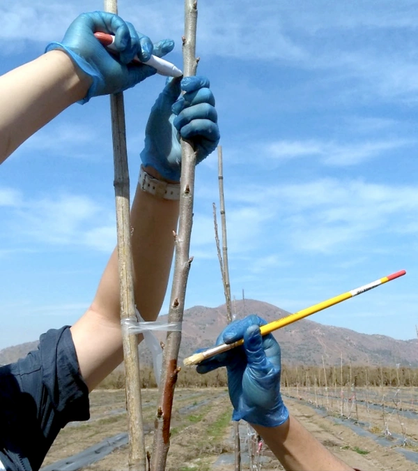 Una pratica comune nel sistema cileno ad asse centrale è l’impiego di regolatori della crescita (citochinine e giberelline) combinato con incisioni nel floema lungo l’asse, in corrispondenza delle gemme vegetative allo stadio di “punta verde” (Fig. 2).