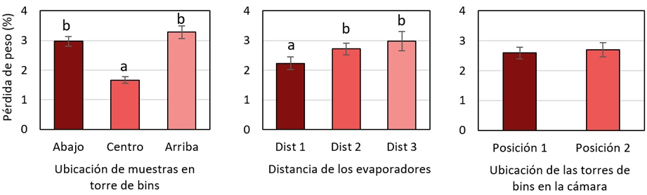La Figura 2 mostra come la perdita di peso vari in modo significativo in funzione della posizione del frutto. I bins superiori, maggiormente esposti al flusso di aria secca, presentano le perdite più elevate, con valori prossimi al 5% all’ottavo giorno, mentre le posizioni inferiori, con migliore incidenza di aria fredda, mostrano perdite nettamente inferiori.