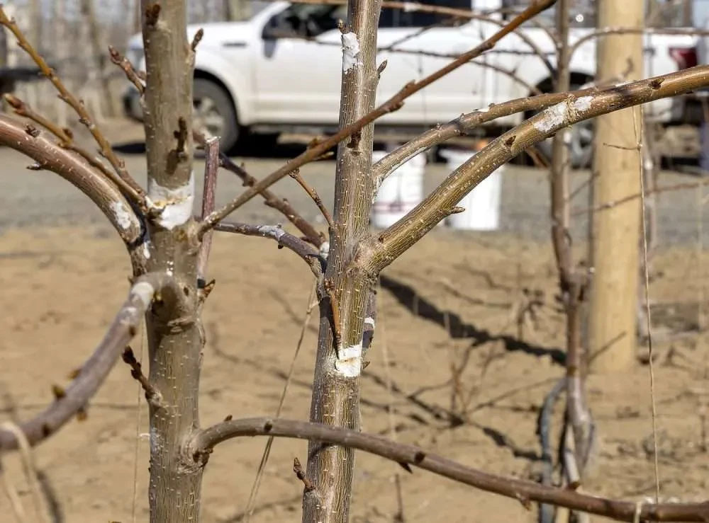 Immagine 3. Una piccola quantità di Promalin per ogni 30 cm di lunghezza del ramo principale è sufficiente per favorire la ramificazione in tutta quell'area, se abbinata all'incisione, come dimostrano i giovani alberi nel frutteto di Goldy a metà maggio. (Kate Prengaman/Good Fruit Grower)